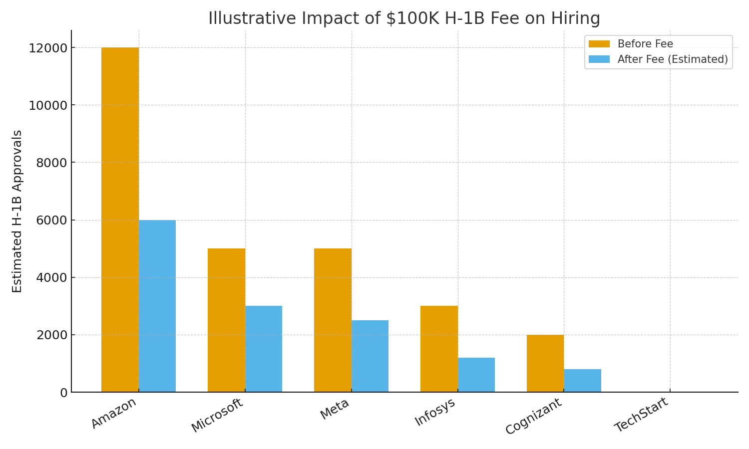 - Big Tech Companies: Large technology firms are the primary users of H‑1B visas and will shoulder enormous new costs. For example, in just the first half of 2025, Amazon (including AWS) received over 12,000 H‑1B approvals, while Microsoft and Meta each had 5,000+ approvals. At $100K a year per visa, that would equate to over $1.2 billion annually for Amazon alone and around $500 million for companies like Microsoft or Meta – a massive new expense. Even for cash-rich tech giants, billions in extra costs could affect budgets and hiring. Many of these firms rely on H-1B talent for critical roles in software engineering, AI, and research, so they face an uncomfortable choice between paying the fee or losing out on skilled workers.