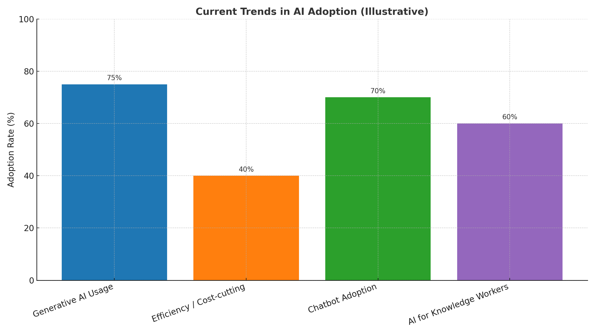 - Chatbots Everywhere: From fielding customer service inquiries to answering internal HR questions, chatbots and virtual assistants have become ubiquitous. These practical, immediate-value tools are now integrated into about 70% of medium-to-large organizations, freeing up human employees to focus on more complex tasks. The result? Faster response times and 24/7 support, without burning out your teams.
