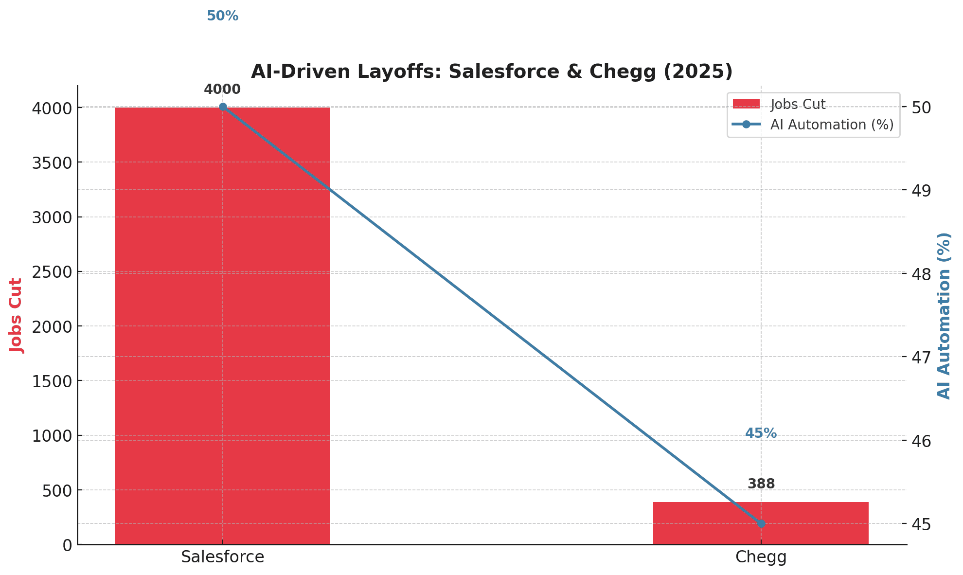 Not long ago, the idea of AI causing mass layoffs felt like science fiction. Now, it’s happening in real time. Salesforce, a leader in software, recently revealed it cut 4,000 customer support jobs because AI chatbots can handle half of all customer interactions. CEO Marc Benioff bluntly stated, “I’ve reduced [support staff] from 9,000 heads to about 5,000, because I need less heads,” noting that 50% of customer queries are now resolved by AI agents instead of humans. In education, Chegg — an online learning platform — announced it had slashed 45% of its workforce (388 employees) after new AI tools like ChatGPT drove students away from its services Chegg is now pivoting to an AI-powered model where an algorithm answers student questions automatically at a “substantially lower cost”